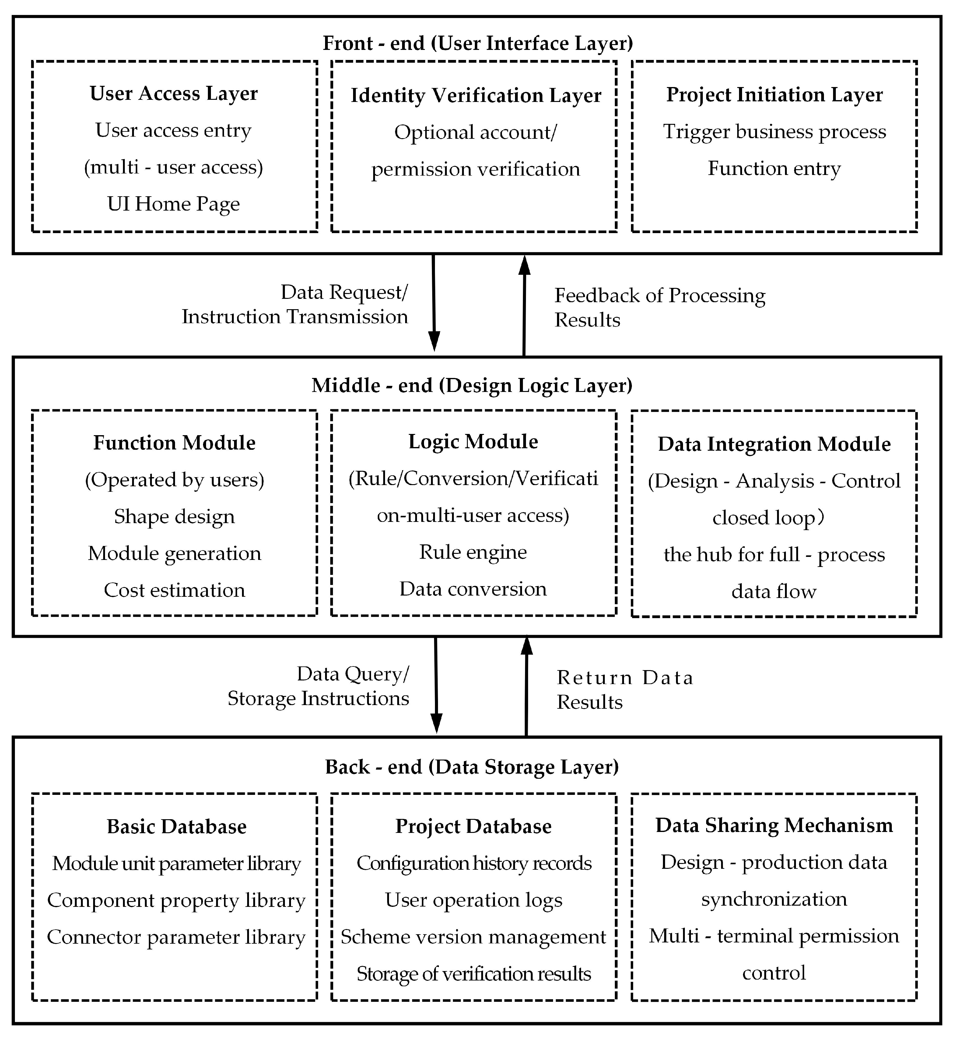 4. Incomplete process coverage | Existing platforms focus on a single stage and lack full-process coverage; | Build a three-level “front-end-middle-end-back-end” architecture covering the full “design-production-assembly” process; |
