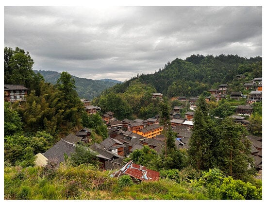 The Dong people are one of the ethnic minorities with a long history mainly distributed in China. They are primarily concentrated in the border areas of Guangxi Zhuang Autonomous Region, Guizhou Province, and Hunan Province in Southern and Southwestern China, with some also living in Enshi Tujia and Miao Autonomous Prefecture in Hubei Province. Their ancestors can be traced back to the Gan Yue tribe, which was part of the Bai Yue ethnic groups during the Qin and Han dynasties. In the agricultural society, the Dong people formed settlements by living together in villages, with clan ties—either one surname per village or multiple surnames per village—serving as a bond. A Dong village usually geographically includes several Dong hamlets. In primitive society, adjacent villages and hamlets would form an alliance organization called “Kuan” to manage important local affairs []. Evolving over time, this has developed into village settlements with unique ethnic characteristics scattered across various parts of China. Among them, representative Dong villages include Zhaoxing Dong Village in Liping County, Guizhou Province, which is known as the “Largest Dong Village in China” and considered as the “First Village of Dong Region”; Baojing Dong Village in Zhenyuan County; Dali Dong Village in Zaima Township, Rongjiang County, Guizhou Province (Figure 1); and Chengyang Eight Villages in Sanjiang County, Liuzhou City, Guangxi Zhuang Autonomous Region.