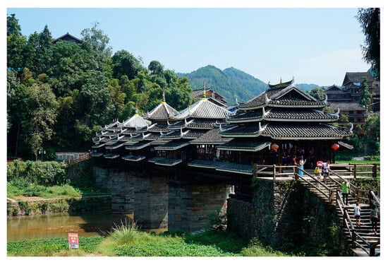 - Li, G. The “Protection” of the Dong Village in Guizhou Province: A Case Study of Drum Towers and Wind-and-Rain Bridges. Archit. J. 2016, 12, 16–21. [Google Scholar]