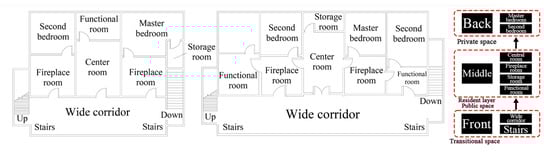 The top floor typically serves as a granary or lodging for unmarried children. As illustrated in Figure 7, the interior layout follows a traditional “front hall, rear chamber” plan, longitudinally divided into three zones (front, middle, and rear) along an entrance-oriented axis. This results in a spatial sequence characterized by a “staircase—wide corridor—fire pit—bedroom” arrangement [].