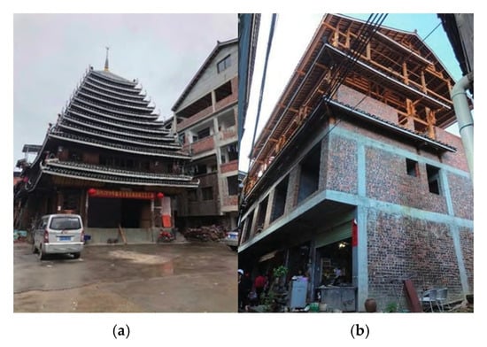 (a) A comparison of the traditional wooden drum towers of the Dong ethnic group in Sanjiang and concrete houses. (b) A combination of a low-rise brick–concrete structure and a high-rise wooden structure with the post-and-lintel system. (Source: []).