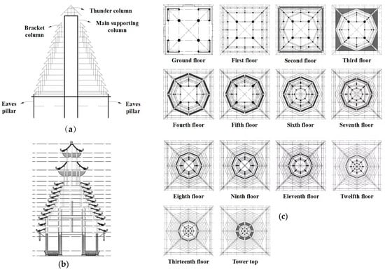 The drum tower stands as a quintessential symbol of Dong architectural culture. Its pagoda-like form (Figure 4) invariably features an odd number of tiers. The elevation can be divided into three distinct sections: the base, the main body, and the crowning roof. Neither the base perimeter nor the walls of the main body incorporate load-bearing enclosures; instead, the entire structure relies on four, six, or eight massive central columns (revered as “golden pillars”), encircled by twelve peripheral eaves columns, all interlocked through sophisticated mortise-and-tenon joinery (Figure 5). Each tier of the main body showcases multiple layers of upturned eaves, while the roof typically adopts hip-and-gable, overhanging gable, or polygonal pyramidal configurations, often crowned with a sacred calabash ornament []. The tower’s structural ingenuity commands admiration—these soaring timber edifices, with their distinctive silhouettes, dominate Dong village skylines as their most conspicuous landmarks. Functionally, they serve as central communal spaces for social gatherings, council meetings, recreational activities, and ritual ceremonies within traditional Dong settlements. Consequently, drum towers invariably surpass all other village structures in height and are invariably surrounded by expansive plazas to accommodate diverse communal functions.