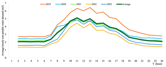 Hourly non-potable water demand for campus rainwater harvesting systems from 2019 to 2022.
