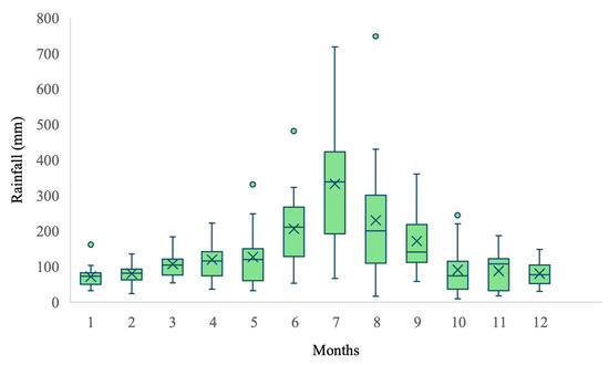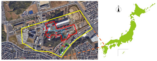 This study focuses on a university campus and its adjacent student dormitory residential area located in Kitakyushu, Japan. The study area is illustrated in Figure 2. Kitakyushu serves as a key transportation hub between Honshu and Kyushu and belongs to the Sea of Japan climate zone. The region is characterized by hot and humid summers with heavy rainfall, and mild winters with little snowfall. Daily precipitation data from 2003 to 2022 (a 20-year period) were collected from the Japan Meteorological Agency [22], as shown in Figure 3. The average annual rainfall is approximately 1707 mm. However, precipitation is unevenly distributed in both space and time, with peaks typically occurring during the summer months (June–July) and the typhoon season (September). This uneven rainfall pattern poses significant challenges for the sizing and operation of urban rainwater harvesting and storage systems. In response, the Kitakyushu municipal government has actively promoted the installation of rainwater harvesting facilities in various buildings, including schools and public institutions, as part of a broader strategy for integrated water resource management. The selected campus and residential area are located within the Kitakyushu Science and Research Park, a newly developed urban district that integrates functions of education, research, and international exchange. Due to its urban planning characteristics and multifunctional structure, the area is considered both representative and scalable for rainwater harvesting research.