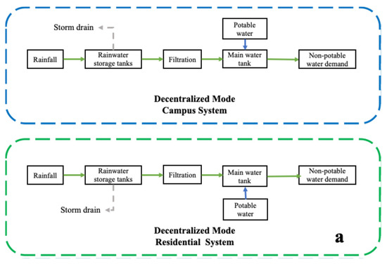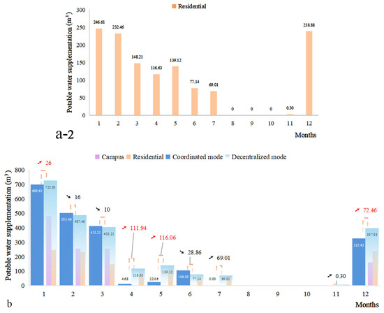 Potable Water Supplementation under Decentralized and Coordinated Modes ((a-1). Campus system under decentralized mode; (a-2). Residential System under decentralized mode; (b). Comparison between coordinated mode and decentralized mode).