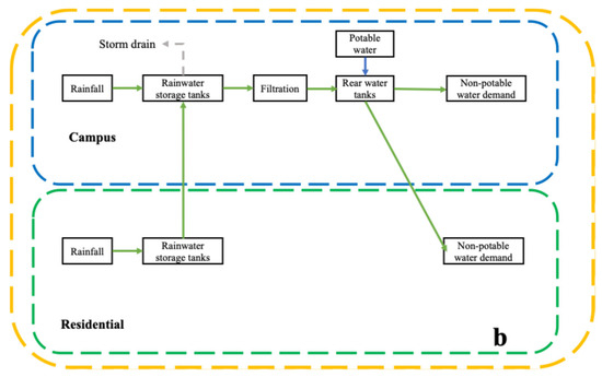 In the coordinated mode, the model follows a sequential allocation strategy in which the non-potable water demand of the campus is prioritized. Any remaining rainwater is then allocated to the residential area. If the residual volume is still insufficient to meet residential demand, potable water is used as a supplementary source. This serial supply logic is implemented by dynamically assessing the remaining volume in the shared storage tank and assigning allocation priority accordingly.