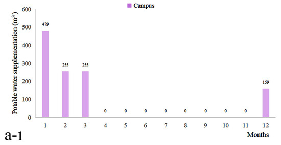 As shown in Figure 5, during the full-year simulation period, the campus RWH system in the decentralized mode required a total of 1148 m3 of potable water supplementation, mainly concentrated in the low-rainfall months of January to March and December. The residential RWH system required 1268.35 m3 of potable water, with supplementation needed in all months except from August to October, during which rainwater was largely sufficient.