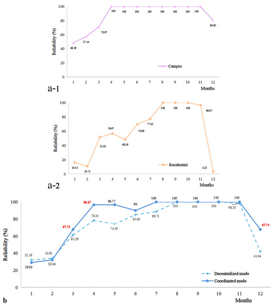 Reliability under Decentralized and Coordinated Modes (a-1). Campus system under decentralized mode; (a-2). Residential System under decentralized mode; (b). Comparison between coordinated mode and decentralized mode).