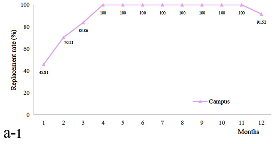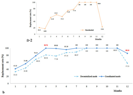 Replacement rate under Decentralized and Coordinated Modes (a-1). Campus system under decentralized mode; (a-2). Residential System under decentralized mode; (b). Comparison between coordinated mode and decentralized mode).