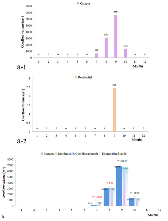 Overflow Volume under Decentralized and Coordinated Modes ((a-1). Campus system under decentralized mode; (a-2). Residential System under decentralized mode; (b). Comparison between coordinated mode and decentralized mode).