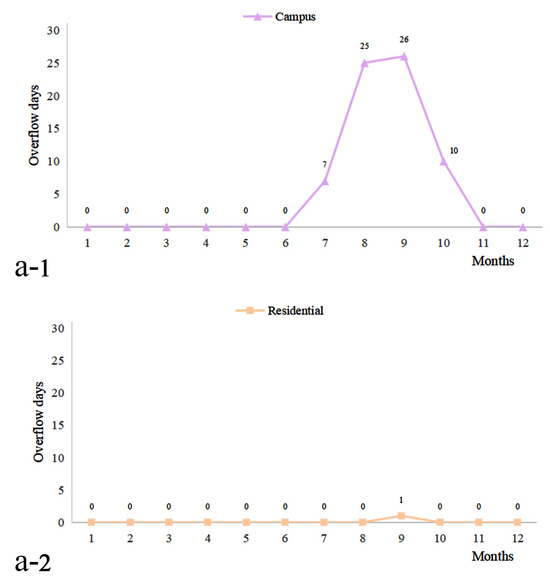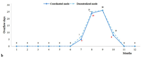 Number of Overflow Days under Decentralized and Coordinated Modes ((a-1). Campus system under decentralized mode; (a-2). Residential System under decentralized mode; (b). Comparison between coordinated mode and decentralized mode).