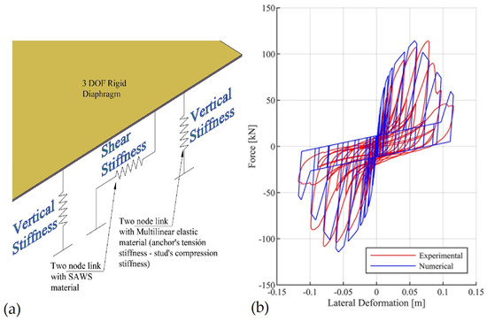 The central link uses the SAWS (Seismic Analysis of Woodframe Structures) material, developed by Folz and Filiatrault (2001) [35], to replicate the nonlinear hysteretic behavior of shear walls. The vertical links use the Multilinear Elastic material to represent the axial force–deformation behavior of the end studs and anchorage, where the obtained anchor’s stiffness is 11,844 kN/m, and the stud’s compression stiffness is 106,753 kN/m. The SAWS parameters were adopted from the calibration presented by Estrella et al. [28]. Figure 5a shows the numerical model configuration, and Figure 5b compares the experimental results from Guiñez [27] for a 3.60 m-long SSW with double OSB panels and 100 mm nail spacing against the model response. As per Figure 5b, the adopted model was able to replicate the shear hysteretic behavior of the wall with high fidelity, including pinching and degradation of strength and stiffness.