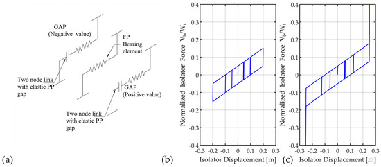 Figure 6a shows a schematic diagram of the proposed model to capture the impact between the slider and the perimetral ring. Figure 6b,c shows the hysteresis obtained from an impact and non-impact low-friction isolator and . Figure 6b shows the force-displacement loop of an isolator obtained with a cyclic pushover of the proposed assembly and a protocol displacement with a maximum displacement . In this case, in the absence of impact, the assembly acts as a conventional DCFP isolator. Figure 6b,c shows the hysteresis obtained from an impact and non-impact low-friction isolator and , where the horizontal axis plots the isolator displacements, and the vertical axis plots the normalized isolator force, which is the isolator lateral force divided by the total weight over the device. Figure 6c shows the hysteresis obtained with a cyclic pushover using a displacement protocol with maximum displacement . As per Figure 6c, it can be observed that the proposed assembly allows the simulation of the effect caused by the impact between the slider and the perimetral ring on both sides.