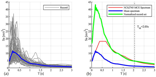 The selection of appropriate ground motions plays a critical role in collapse assessment using IDA [39]. FEMA P695 provides two record sets compatible with US crustal tectonic regimes (far-field and near-field). However, since this study focuses on evaluating the collapse capacity of Chilean representative LFTBs, the ground motions from FEMAP695 cannot be directly used. In contrast, for Chile’s subduction zone, Estrella et al. [39] propose conducting IDA using a representative set of 26 ground motions, comprising 18 subduction and 8 crustal earthquake records. The selection criteria proposed by Estrella et al. [39] include definitions of earthquake magnitude (above 6.5), fault type, distance to fault (greater than 10 km), records with two horizontal orthogonal components, peak ground acceleration greater than 0.2 g, peak ground velocity more than 15 cm/s, ground motions coming from soft rock and stiff soil, and records with instrumental and baseline corrections. Thus, these records include two horizontal components ( and ) and span moment magnitudes () from 6.5 to 9, recorded over the last 30 years. To align with FEMA P695 guidelines, each record was first normalized individually and then scaled collectively. Normalization was done to remove variability due to differences in earthquake magnitude, fault type, and distance, using peak ground velocity (PGV) and normalization factors () from Estrella et al. [39]. The set was then scaled collectively to the , value at the MCE level. Figure 7a presents the 5% damped acceleration response spectra of the normalized records and their median. Figure 7b shows the spectra of the median record scaled to the MCE level for archetype BLD-4. Notably, collective scaling increases spectral acceleration values at higher frequencies. It is worth mentioning that the higher effective damping ratios (20–50%) reported in Table 3 arise from hysteretic energy dissipation of the frictional isolators and were directly captured through the nonlinear isolator model.