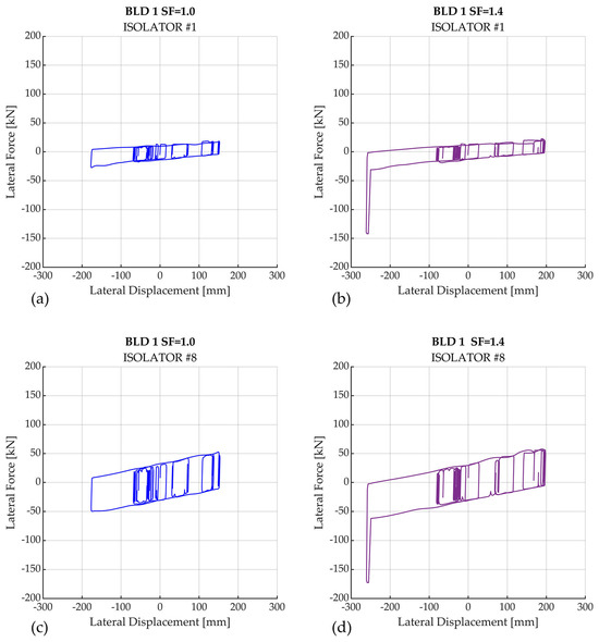 To illustrate the behavior of the isolated buildings under seismic excitation, a nonlinear dynamic analysis was conducted using the C1 component of the Cape Mendocino earthquake. Results for BLD-1 are presented in Figure 9, Figure 10 and Figure 11. Figure 9a shows the hysteretic response of isolator #1 (corner bearing) for the as-recorded motion. When this record is scaled by a factor of 1.4, as shown in Figure 9b, the displacement demand exceeds the isolator gap (, triggering impact and increased lateral force. Similar trends were observed in isolator #8 (interior bearing); Figure 9c,d show the difference in response with and without impact.
