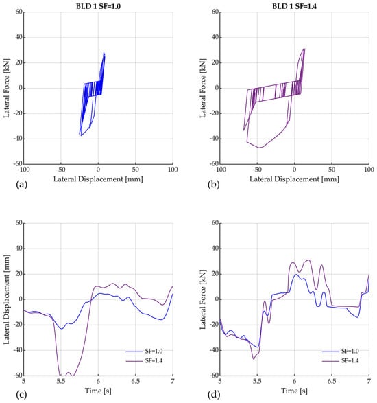 On the other hand, Figure 10 examines the SSW located above isolator #1. The lateral force-deformation behavior is illustrated in Figure 10a,b, showing the record without scaling and with scaling, respectively. As per Figure 10a, the SSW does not reach its maximum strength. However, when the record is scaled at SF = 1.4 (Figure 10b), the wall reaches its strength capacity and undergoes stiffness degradation. Figure 10c shows the SSW’s lateral displacement time history. It can be seen in this Figure that at 5.5 s, the maximum lateral displacement of the SSW is when the wall is subjected to the as-recorded ground motion and when it is amplified by 1.4. These results show that the impact of the isolation system produces an increase in the shear demand of the SSWs, which causes a considerable displacement of the first-story walls, potentially leading them to collapse. It is worth noting that, in this case, the IDA allowed verifying that the PDR exceeded the collapse limit value of 3% when the scaling factor was 1.5. Figure 10d shows the SSW lateral force history; it is observed that there is no significant increase in force at 5.5 s, where the lateral force of the SSW varies from 37 to 42 kN when the as-recorded and amplified ground motion records (by 1.4) were applied, respectively.