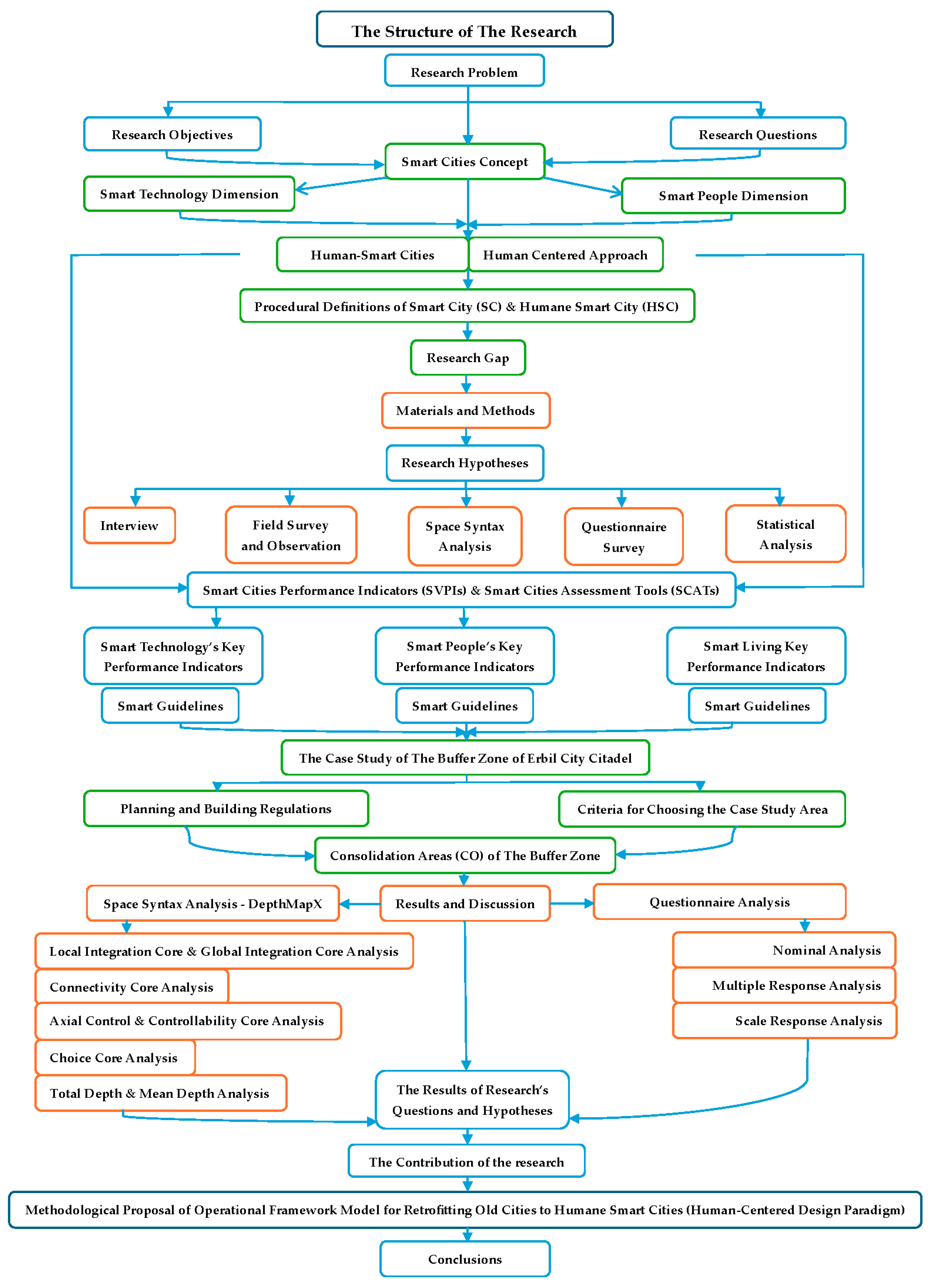 - Specify some smart guidelines and develop a strategic, human-centered, comprehensive, and conceptual framework model integrated with smart technology using a set of smart city performance indicators as human-centered technological strategies to be applied in Erbil City to retrofit the old city into a smart one.