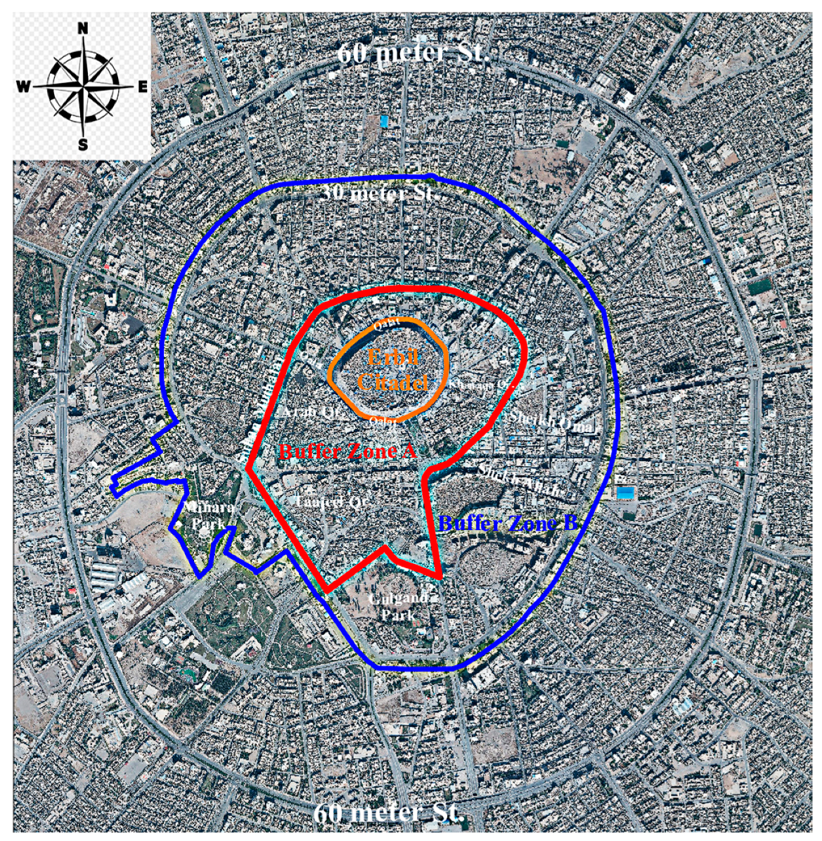3.4.4. Criteria for Choosing the Study Area in the Buffer Zone of Erbil Citadel