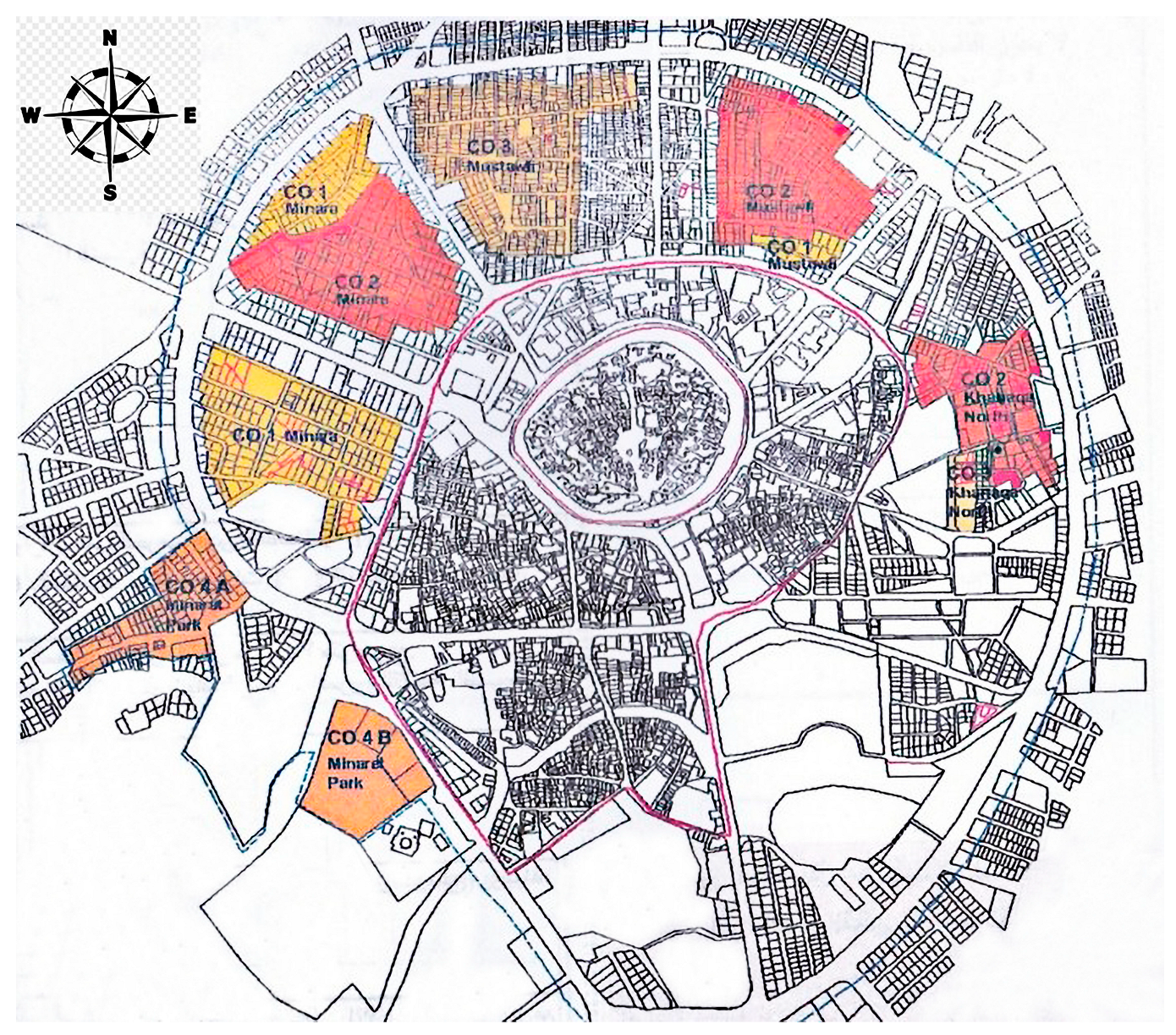 - Buffer Zone B: The area between the first ring road (Al Muzaffariyah Road) and the thirtieth ring road (30 m), and the area surrounding Al Manara Park. This area is subject to a lower degree of protection.