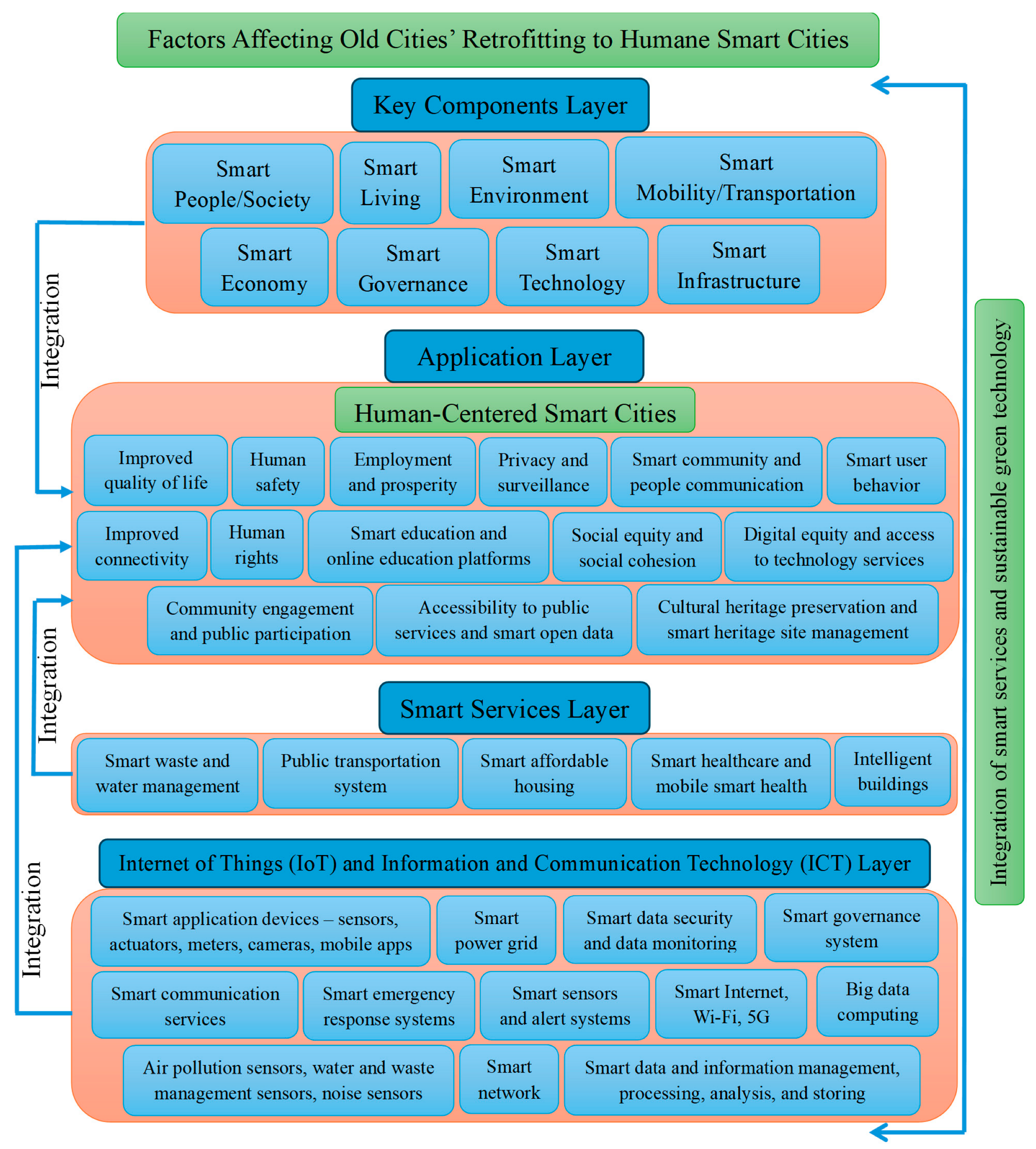- There is limited practical research on ICT and a human-centered approach in Erbil City, and there is a gap between theoretical discussions and empirical research on the application of these technologies in Erbil City and how it can be retrofitted into a smart city. Therefore, a significant research gap emerged in presenting a holistic, comprehensive perspective study that covers the integration of smart technology with human needs.