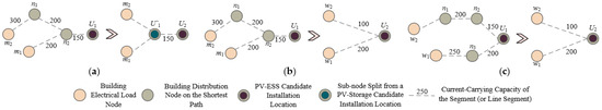 Strategy for simplifying the node network in the minimally invasive design of the PEDF systems: (a) The distribution path from the electricity consumption node to the PV-ESS candidate point shares a common current-carrying segment which is a bottleneck; (b) The distribution path from the electricity consumption node to the PV-ESS candidate point shares a common current-carrying segment which is NOT a bottleneck; (c) The distribution path from the electricity consumption node to the PV-ESS candidate point has no common current-carrying segments.