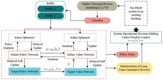 In the PEDF systems retrofitted into an existing building with minimal invasiveness, the hardware architecture possesses inherent constraints due to the limitations of the retrofitting conditions. These include non-optimal PV installation orientation, potential additional line losses from suboptimal storage placement, and extended cable pathways. This implies that, compared to a new system built from scratch, its operational optimization faces greater challenges and relies more heavily on a highly intelligent, self-adaptive energy management core capable of perception and decision-making. This paper introduces DRL [31,32] to address this “software strategy” optimization problem. Its core principle is to train an agent that continuously interacts with an uncertain environment and learns an optimal scheduling policy by maximizing long-term cumulative reward. To achieve this, the Twin Delayed Deep Deterministic Policy Gradient (TD3) algorithm is employed. This algorithm is an advanced evolution of DDPG [33], which effectively overcomes the problem of Q-value function overestimation bias by introducing a twin Critic network structure [34], supplemented by a delayed policy update mechanism to significantly enhance the stability of the training process and the reliability of the final policy. It is particularly suited to the characteristics of this problem, which features a continuous action space, high-dimensional state observations, and complex environment dynamics.