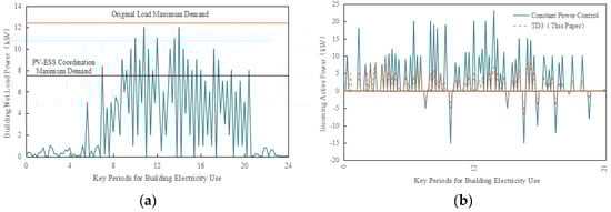 Comparison of optimization effects for “Building-side Cooperative Regulation—Grid-side Interaction Characteristics” of the existing building’s PEDF systems: (a) Comparison of load-PV-ESS cooperative regulation characteristics before and after optimization; (b) Comparison of incoming line power optimization effects, demonstrating how coordinated control enables economic savings through peak shaving and improves grid stability via smoothed power injection/consumption, facilitating proactive grid partnership.