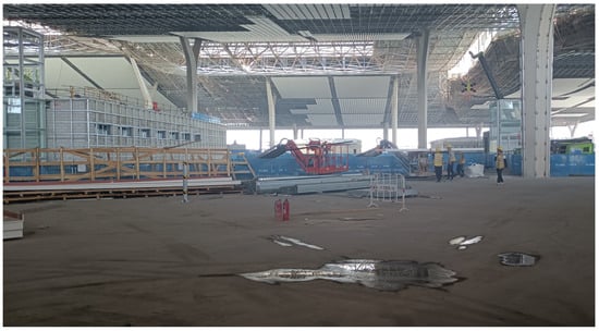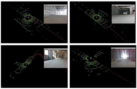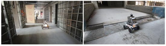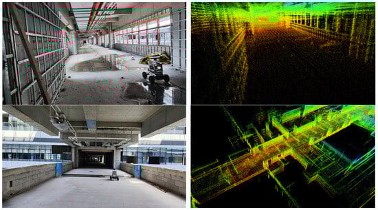 Experiments were carried out at the installation construction site of an outpatient building of a hospital in Xi’an. This outpatient building is a typical large-scale public building. The main civil engineering structure has been topped out, and the focus of work is gradually shifting indoors. Multiple sub projects such as building water supply and drainage, heating, ventilation and air-conditioning, electrical building, and intelligent building are under construction simultaneously, with decoration and fit out works interspersed. Doors, windows, and curtain walls have not been installed yet, while ceiling and wall construction is in progress. Meanwhile, the construction of air-conditioning systems, lighting systems, firefighting facilities, mechanical and electrical equipment, and low-voltage electrical facilities is also being carried out in an interleaved manner. There are many dynamic construction workers, semi dynamic unstructured obstacles such as scaffolding, elevated work platform vehicles, and carts for transporting building materials at the construction site, as shown in Figure 9. Some areas of the hospital outpatient building construction site are under floor construction and are closed. Therefore, considering safety factors at the actual construction site, the moving speed and range of the inspection robot are less than those in the simulation environment. In this paper, data were collected on one standard floor of this large-scale public building. During the data collection process, the inspection robot experimental platform was manually controlled to move at the construction site for data collection using an Xbox360 controller (manufacturer: Qiaotou Kupeng Electronics Factory, Dongguan, China). The moving speed was set at 0.5 m/s, and the experimental time was 2067 s. Topic data from sensors such as LiDAR, IMU, and cameras were stored in Rosbag data packets.