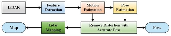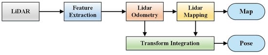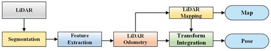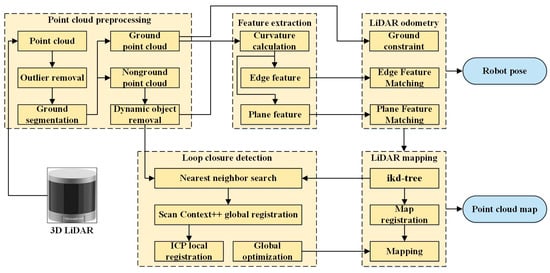 The LeGO-LOAM-LPB algorithm proposed in this study comprises five modules: ground point cloud preprocessing, feature extraction, LiDAR odometry, LiDAR map construction, and loop closure detection. The overall system framework is illustrated in Figure 5. The specific steps are as follows: