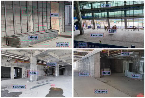 At installation construction sites of large-scale public buildings, diverse materials such as concrete, metal, glass, plastic, and wood are commonly present (Figure 6). The surfaces of these materials exhibit heterogeneous reflectivity, which can result in weak or distorted echo signals and degrade the quality of LiDAR point clouds. When two adjacent planes are composed of different materials, their reflectivity differs markedly. Consequently, the reflection intensity varies substantially, even though the distances from the surrounding points to the LiDAR remain nearly identical []. In both cases, points exhibiting large variations in reflection intensity or distance are removed. Specifically, the removed points can be formulated as: