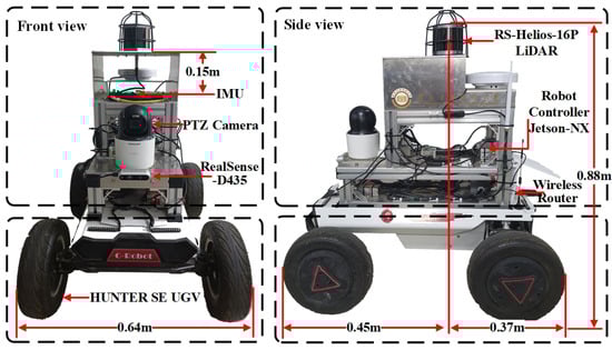 The experimental platform of the inspection robot and its principal components are illustrated in Figure 7. The inspection robot is powered by a 24 V lithium iron phosphate battery (30 Ah capacity). A motor drive controller regulates motor rotation speeds to enable precise attitude adjustment and motion control, achieving a maximum velocity of 3.0 m/s. The onboard computing platform an NVIDIA Jetson Xavier NX module, which communicates with the motor controller via a CAN (Controller Area Network) bus interface. Pulse–width modulation (PWM) signals govern both drive and steering motors. Sensor instrumentation includes a 16-line 3D LiDAR (RS-Helios-16P) and a nine-axis inertial measurement unit (IMU). The 3D LiDAR is mounted horizontally atop the robot at 0.88 m ground clearance, featuring a 360° horizontal field of view, 30° vertical field of view (±15°), 0.4° horizontal angular resolution, 2° vertical angular resolution, 10 Hz frame rate, ±2 cm accuracy, and 0.2–150 m effective range. The IMU operates at 200 Hz and is installed horizontally 0.15 m below the 3D LiDAR, maintaining precise spatial registration.