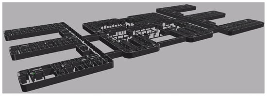 During the establishment of the simulation model for large-scale public building construction sites, to make the 3D environment model closer to the actual construction site, the construction CAD drawings are first processed by deleting semantic information of equipment specialties such as fire-fighting, lighting, power supply, and distribution in the drawings. Then, a BIM model is established based on the processed CAD drawings. Finally, the model is optimized through Blender to reduce the consumption of computational resources during Gazebo simulation. The optimized model is imported into the Gazebo simulation platform to form a simulation environment for large—scale public building construction sites. The establishment process of the simulation environment is shown in Figure 8. A BIM 3D model is established based on the CAD construction drawings of an under-construction outpatient building of a hospital in Xi’an. After being optimized by Blender, this model is imported into the Gazebo simulation platform to simulate the construction site environment. This hospital outpatient building is a typical large—scale public building. One standard floor is selected for modeling. The length of this standard floor is 292 m, the width is 142 m, the height is 6 m, and the area is 27,152 m2. The ground of this simulation environment is flat and contains walls, columns, long corridors, large—span spatial structures, and various hospital rooms with complex functions, as shown in Figure 8. It can be seen from the figure that this scene contains a large number of windowless long straight corridors, which are scarce in features, especially lacking linear features.