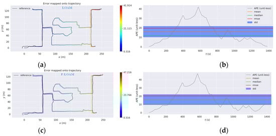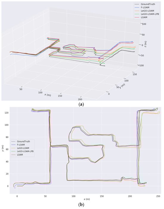 Due to factors such as severe line of sight obstruction and difficulties in laying out measurement points at the installation construction site of large-scale public buildings, it is difficult to obtain the true movement trajectory of the inspection robot using a total station. Therefore, the dataset in the simulation environment of the large-scale public building construction site is used to evaluate the overall consistency between the trajectory output by the SLAM algorithm and the true trajectory. The evo_ape tool is used to evaluate the Absolute Pose Error (APE) of each SLAM algorithm based on the ground—truth trajectory. During the evaluation, both rotation and translation errors are considered, and the resulting absolute pose error is unitless. The specific evaluation indicators of APE include maximum error (Max), average error (Mean), median error (Median), root mean square error (Rmse), and standard deviation (Std), etc. The smaller the indicator data, the lower the error. The absolute pose errors of different SLAM algorithms are shown in Table 1. As can be seen from Table 1, in the simulation environment of the large-scale public building construction site, the proposed LeGO-LOAM-LPB algorithm has the lowest errors in all aspects. Compared with the original LeGO-LOAM before improvement, all indicators have significantly improved, with the root mean square error reduced by 41.55%.