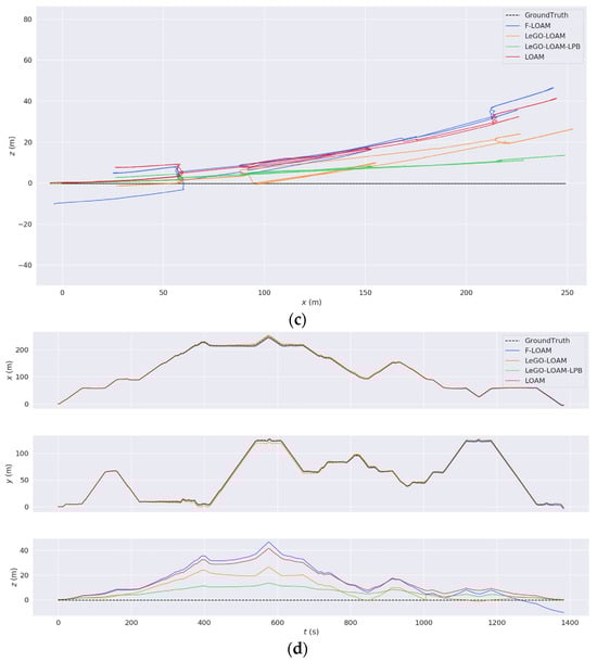 Comparison diagram between the estimated trajectory and the true trajectory of the SLAM algorithm. (a) Three-dimensional trajectory diagram. (b) XY-plane trajectory diagram. (c) XZ-plane trajectory diagram. (d) Time-series diagrams of the trajectories in the directions of each coordinate axis changing with time.