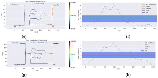 Trajectory error plot of the SLAM algorithm. (a) LOAM spatial error heat map. (b) LOAM temporal error distribution plot. (c) F-LOAM spatial error heat map. (d) F-LOAM temporal error distribution plot. (e) LeGO-LOAM spatial error heat map. (f) LeGO-LOAM temporal error distribution plot. (g) LeGO-LOAM-LPB spatial error heat map. (h) LeGO-LOAM-LPB temporal error distribution plot.