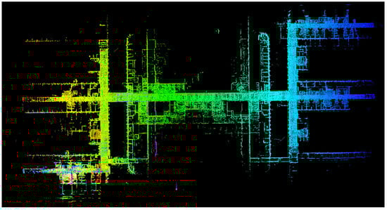 During the operation of the inspection robot at the actual installation construction site of large-scale public buildings, the global point cloud map constructed based on the LeGO-LOAM-LPB algorithm is shown in Figure 13. This global map comprehensively reflects the large-scale structural features of the site, including walls and spatial structures. Figure 14 shows the actual photo of the local environment at the construction site and its corresponding local point cloud representation. It can be seen that whether it is the window frames, metal connectors on the walls, or the thermal insulation materials stacked on the ground, the point cloud map is highly consistent with the actual environment, without distortion or drift. It demonstrates good spatial continuity and structural restoration ability, providing reliable environmental model support for subsequent positioning, obstacle avoidance, and path planning.