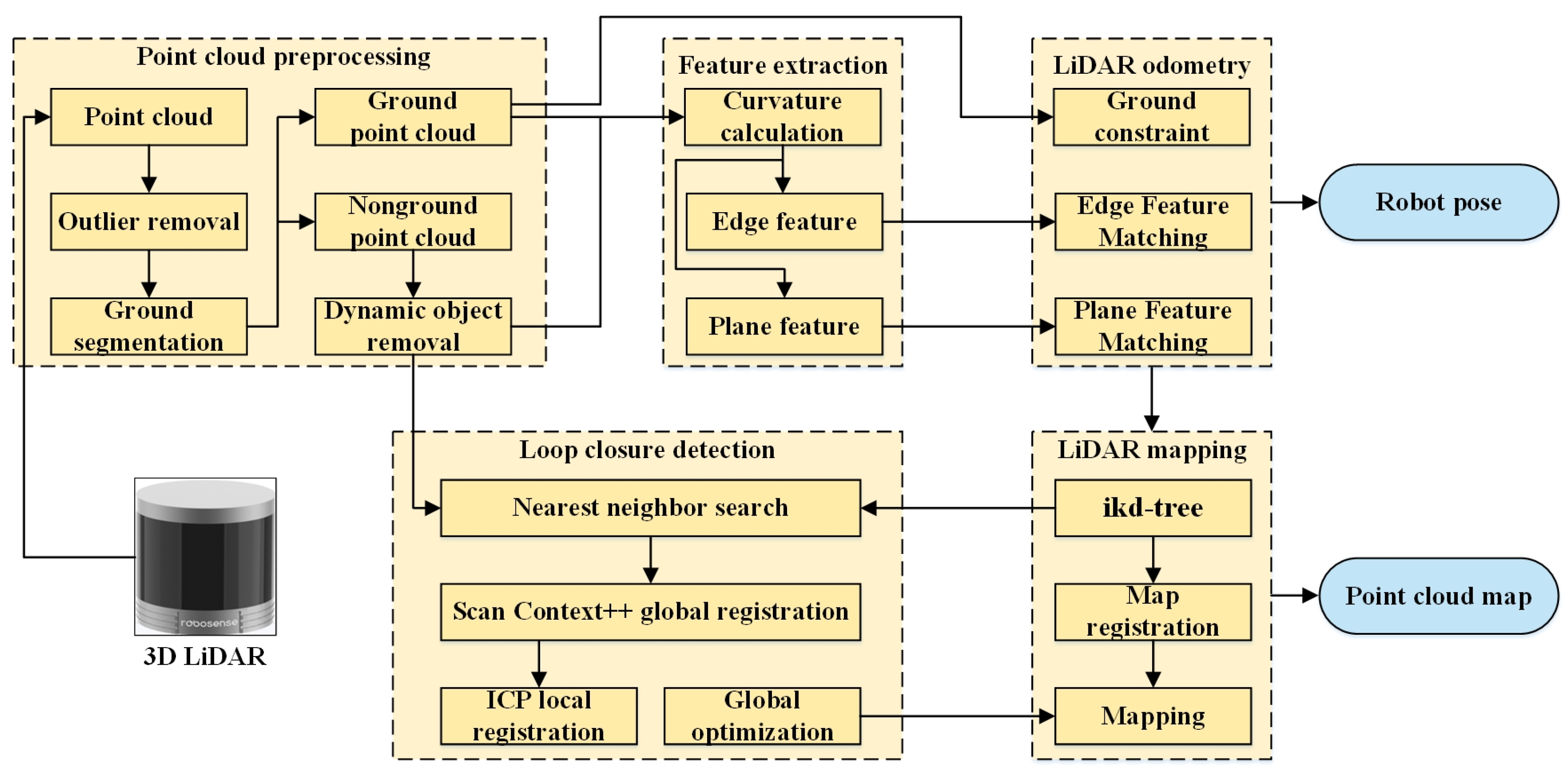 (1) Point cloud preprocessing: We introduce strategies such as outlier removal, ground point extraction, and dynamic object filtering to improve feature stability and representational capacity, thereby enhancing pose-estimation accuracy at the source.