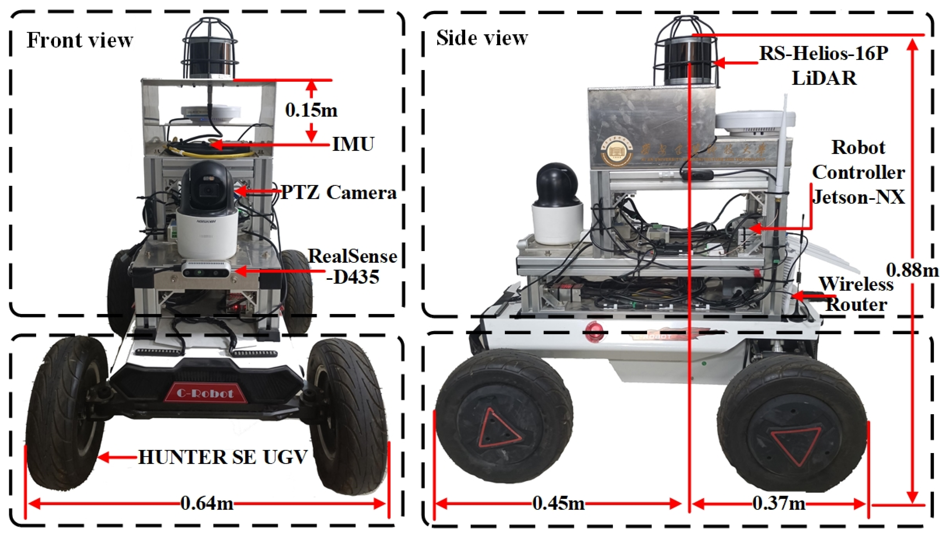 The experimental platform of the inspection robot and its principal components are illustrated in Figure 7. The inspection robot is powered by a 24 V lithium iron phosphate battery (30 Ah capacity). A motor drive controller regulates motor rotation speeds to enable precise attitude adjustment and motion control, achieving a maximum velocity of 3.0 m/s. The onboard computing platform an NVIDIA Jetson Xavier NX module, which communicates with the motor controller via a CAN (Controller Area Network) bus interface. Pulse–width modulation (PWM) signals govern both drive and steering motors. Sensor instrumentation includes a 16-line 3D LiDAR (RS-Helios-16P) and a nine-axis inertial measurement unit (IMU). The 3D LiDAR is mounted horizontally atop the robot at 0.88 m ground clearance, featuring a 360° horizontal field of view, 30° vertical field of view (±15°), 0.4° horizontal angular resolution, 2° vertical angular resolution, 10 Hz frame rate, ±2 cm accuracy, and 0.2–150 m effective range. The IMU operates at 200 Hz and is installed horizontally 0.15 m below the 3D LiDAR, maintaining precise spatial registration.