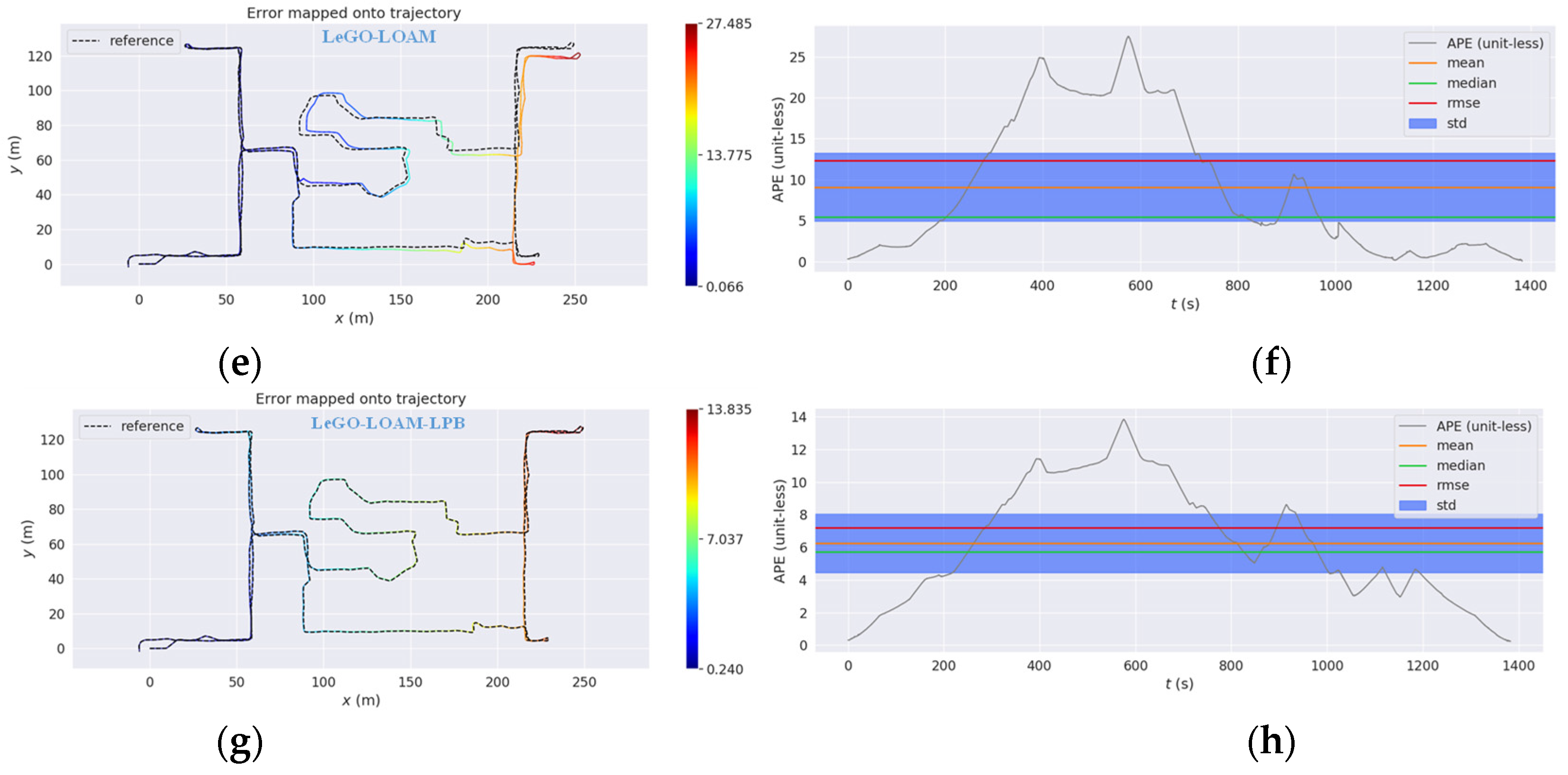 Figure 12. Trajectory error plot of the SLAM algorithm. (a) LOAM spatial error heat map. (b) LOAM temporal error distribution plot. (c) F-LOAM spatial error heat map. (d) F-LOAM temporal error distribution plot. (e) LeGO-LOAM spatial error heat map. (f) LeGO-LOAM temporal error distribution plot. (g) LeGO-LOAM-LPB spatial error heat map. (h) LeGO-LOAM-LPB temporal error distribution plot.