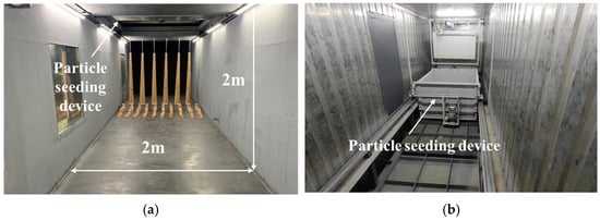 Simulator of Natural Action of Wind-Rain-Heat-Snow for Space Structures: (a) test section of the wind tunnel; (b) particle seeding device.