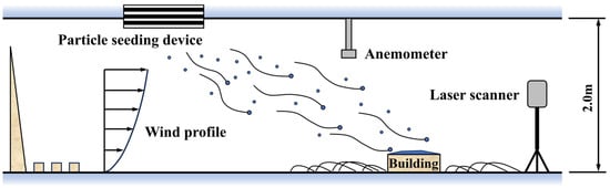 To assess the prediction accuracy of the revised numerical model, a comparative analysis was undertaken using test results of snowdrift on a flat roof. The test was conducted in the “Simulator of Natural Action of Wind-Rain-Heat-Snow for Space Structures” at Harbin Institute of Technology []. This simulator combines an atmospheric boundary layer wind tunnel, a refrigeration system, and a particle seeding device, as shown in Figure 2. During the wind–snow test, the refrigeration system cools the airflow inside the wind tunnel to achieve the low-temperature atmospheric boundary layer wind environment required for the experiment. Subsequently, through the vibration of the particle seeding device, experimental particles (e.g., stored natural snow or artificial snow) are seeded into the test section. These particles then fall with the airflow and settle evenly over the model area, creating a quasi-realistic snowfall environment, as illustrated in Figure 3. The simulator enables the precise generation of a controllable low-temperature snowfall environment, with the temperature adjustable from −20 °C to 25 °C. The test section of the simulator has a 2 m × 2 m cross-section and offers wind speeds that can be continuously adjusted between 0.5 m/s and 20 m/s.