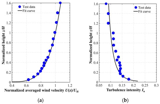 Experimental inflow profiles: (a) normalized averaged wind velocity; (b) turbulence intensity.