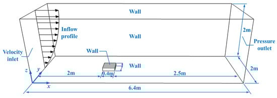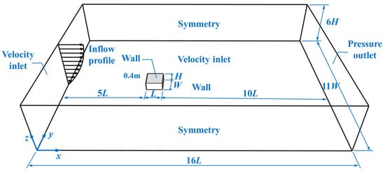 This section initially examines the accumulation characteristics of various particle morphologies on basic flat roofs. The flat-roofed buildings used in this study had a width (W) of 10 m and an eave height (H) of 5 m, with streamwise spans (L) set at 10 m, 20 m, and 30 m, respectively. The computational domain was constructed with dimensions of 16L (x) × 11W (y) × 6H (z). Specific dimensions and boundary conditions are detailed in Figure 9. To simulate the actual snowfall process, the inflow and upper boundaries were configured as velocity inlets to ensure that the falling snow could uniformly cover the entire computational domain []. The outflow boundary was designated as a pressure outlet. The lateral boundaries were set as symmetric, and both the ground and model surfaces were treated as no-slip wall boundaries. The domain employed a structured meshing approach, with the first layer grid height set at 0.01 m (y+ is around 150). The inflow wind profile adhered to an exponential distribution with a roughness index of 0.15 [], and the wind speed at the eave height UH was fixed at 4 m/s. The roughness length on snow surface z0 was set at 3 × 10−5 m []. The inflow snow volume fraction αin was based on measured data from Harbin, taken as 1.3 × 10−5 []. The physical parameters of all snow particles were referenced from the research by Zhang et al. [], with a snow particle density ρs of 250 kg/m3, a particle diameter ds of 0.5 mm, a threshold friction velocity u*t of 0.2 m/s, and a saltation particle settling velocity wf of 0.2 m/s.