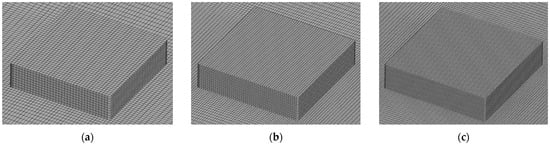 The numerical simulation strictly followed the experimental conditions, with the computational domain’s dimensions and boundary conditions set based on the parameters of the test section (Figure 5). Notably, the inflow boundary was defined as a velocity inlet to simulate the incoming airflow and falling snow, in accordance with the experimental setup (Figure 3). The computational domain was discretized using structured grids. Based on the observed saltating heights of drifting snow, the height of the first grid layer was set to 0.01 m. Before the formal simulation, the grid sensitivity analysis was conducted. Here, three meshing projects with different resolutions were drawn, i.e., the coarse mesh (approximately 630,000 cells), basic mesh (approximately 700,000 cells) and fine mesh (approximately 820,000 cells). Figure 6 illustrates the mesh distribution around the flat-roofed building under different grid refinement levels. The final results show that the snowdrift patterns between the basic and fine mesh cases are basically same. Further grid refinement would not significantly affect the solution accuracy. Therefore, the basic mesh project was finally adopted.