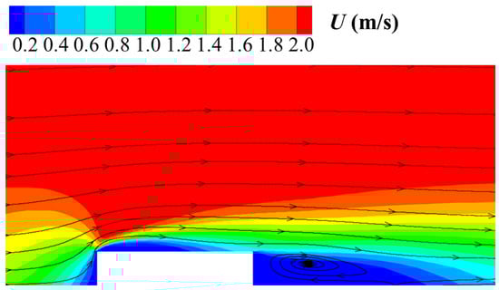 Contour of the airflow streamwise velocity on the central vertical cross-section of the flat-roofed building.