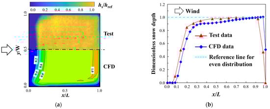 Comparisons of snow distributions on the flat roof between the test and simulation: (a) overall dimensionless snow depths hs/href on the flat roof; (b) dimensionless snow depth hs/href profiles along the central axis of the flat roof.