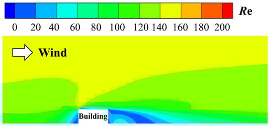 Spatial distribution of the Reynolds number Re on the central vertical cross-section of the flat-roofed building (inflow wind velocity UH = 4 m/s at the eave height).