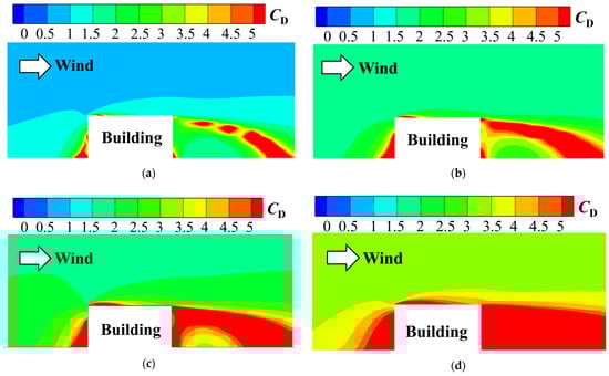 Based on the spatial distribution of Reynolds numbers in Figure 10 and empirical formulas of drag coefficient illustrated in Equations (5)–(9), Figure 11 presents the distributions of drag coefficients CD for various snow particle morphologies on the central vertical cross-section. In contrast to the distribution pattern of Reynolds numbers, the drag coefficients of falling snow particles exhibit a sharp increase in the low-Reynolds-number regions around the building. Within the same region, the drag coefficients of different snow particle types follow an ascending order, i.e., spherical, rosette-shaped, aggregate and plate-like.