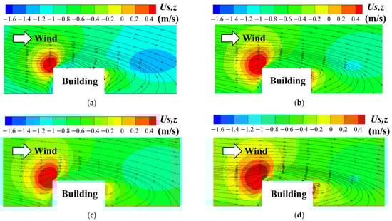 Distributions of vertical velocities for various snow particle morphologies Us,z on the central vertical cross-section of the flat-roofed building: (a) spherical form; (b) rosette form; (c) aggregated form; (d) plate form.