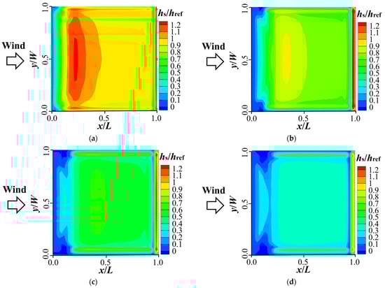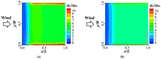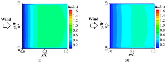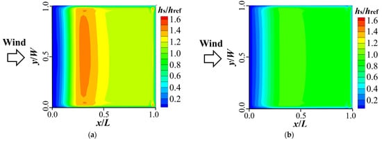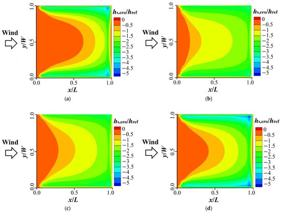 Compared to inclined roofs, the airflow velocity over flat roofs generally remains below the critical wind speed threshold required for snow drifting. Therefore, the snow distribution characteristics on flat roofs are merely governed by the near-ground snow concentration-dependent deposition effect. In contrast, single-pitched roofs, characterized by their inclined surfaces, are more prone to direct impact from upstream airflow, which leads to significant snow erosion. Consequently, the final snow distribution on single-pitched roofs is influenced not only by the snow concentration near the ground, but also closely tied to the distribution characteristics of high-velocity airflow above the roof. Figure 17 illustrates the dimensionless wind-induced erosive snow depths hs,ero/href on the single-pitched roof, where negative values indicate a reduction in snow depth. Generally, only minor erosion is observed within the “bell-shaped” low-velocity region. However, obvious snow erosion is evident in the airflow impact zones along the lateral edges, as well as the downstream area of the roof, which will significantly reduce the peak snow depth caused by snow deposition. It should be noted that due to the secondary flow separation occurring near the downwind eave, a region of low friction velocity forms, which reduces the wind-induced erosion in this area.